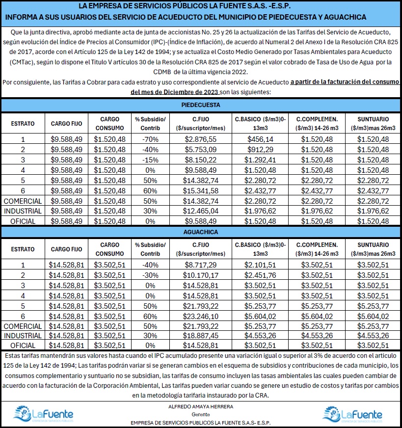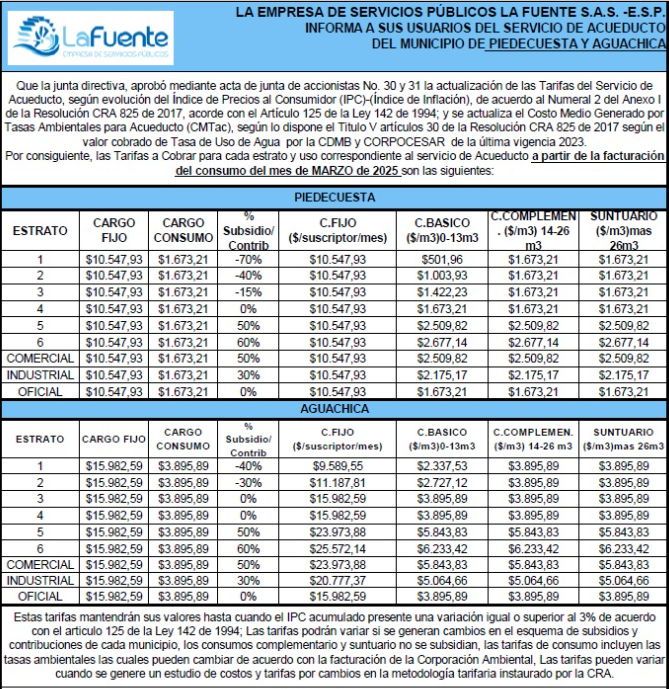 Conozca la factura de los servicios que la Empresa de servicios públicos LA FUENTE S.A.S. E.S.P. ofrece y presta en la ciudadela valle de barro blanco.